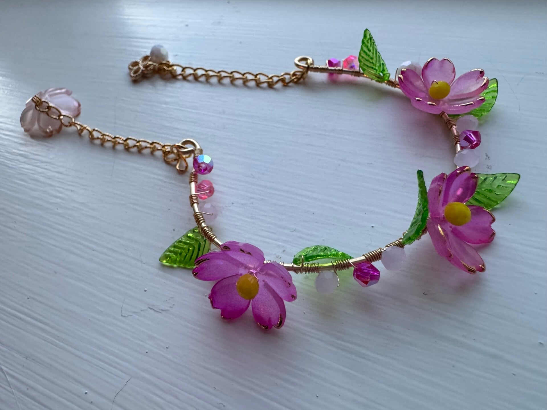 Ett set om ett armband, och ett par örhängen. Färgerna går inrosa toner, tillsammans med grönt och guld.