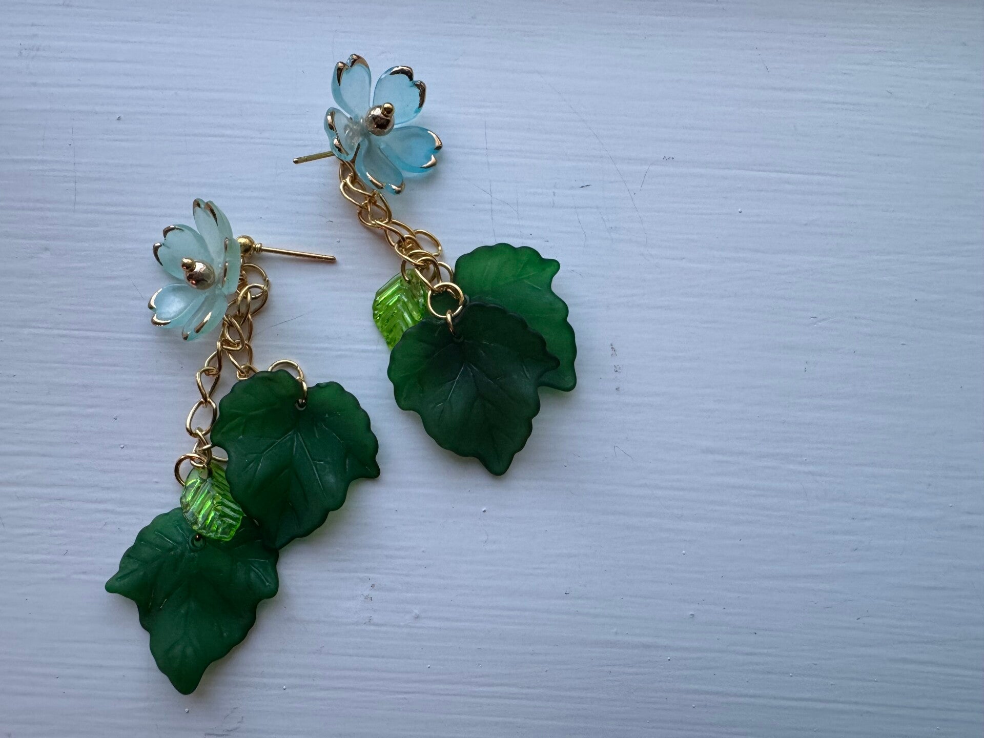 Ett set om ett armband, och ett par örhängen. Färgerna går i blå toner tillsammans med grönt och guld.